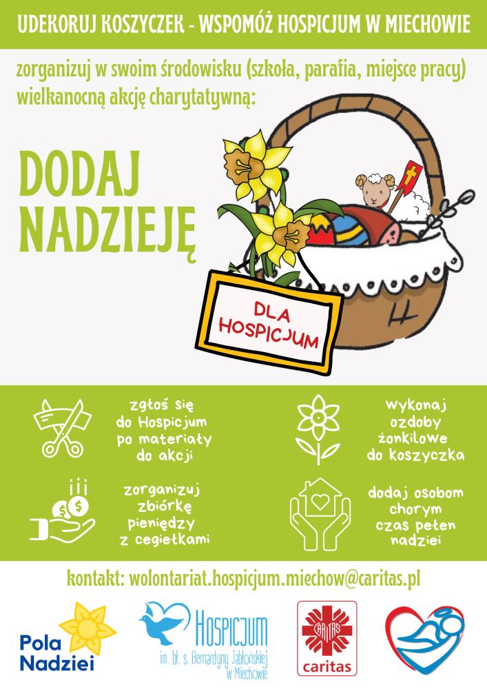 Przed nami czas przygotowania do Świąt Wielkiej Nocy, które niosą przesłanie Miłości i Nadziei. Tradycyjnie udekorujemy swoje domy wielkanocnymi, a w Wielką Sobotę przygotujemy koszyczek z pokarmem do poświęcenia. Zachęcamy do zorganizowania w tym okresie wielkanocnej akcji charytatywnej DODAJ NADZIEJĘ. Jak to zrobić?